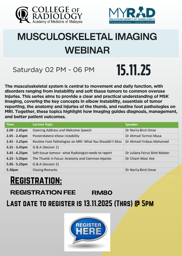 General Health Information Circulars & Guidelines Special Interest Groups Publications Collection Breast Health Infonews MyRad - AGM Notice & AgendaCoR - AGM Notice & Agenda CoR-MPS MOU >MyRad-MPS MOU > AGM 2022 2nd NoticeAGM 2022 1st NoticeNow Available: Three New IAEA Online Courses in Radiation Protection of PatientsInternational Day of Radiology (IDoR 2021)How to improve access to medical imaging in low- and middle-income countries? Enhancing Optimization Strategies in Radiological Practice Webinar Series 2025MUSCULOSKELETAL IMAGING WEBINARRadiology MedEx And Entrance Exam Preparatory CourseThoracic Imaging WebinarAsiaSafe MRI Safety Looking for virtual space to advertise your product? Look NO further. We provide the space you’re looking for. ADVERTISE WITH US Be Part of CoR JOIN AS MEMBER Core Values We aim to serve patients and society by maximising the value of radiology, clinical oncology, interventional radiology, nuclear medicine, medical physics and other allied health sciences Learn More