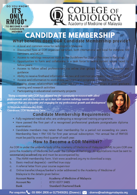 As COR is under the umbrella body of the Academy of Medicine of Malaysia (AMM); to join COR one joins the Academy of Medicine, but under the College of Radiology. All applications must be sent to secretariat@acadmed.my and must be accompanied by;